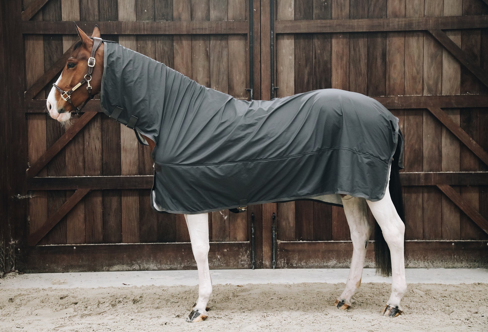 The Rain Coat is a must have for every competition rider to protect his horse and his expensive tack against heavy rain. It is compact, lightweight and 100% waterproof. It is easy to put over another rug or saddle while walking the horse on rainy days. The material is 100% polyester with a PU coating on the outside and will guarantee your rug to be 100% waterproof. There is a small Velcro at the poll to attach the neckpiece to your halter or bridle. You can also find Velcro straps at the neck, a single front closure, a surcingle and tail cord to keep your rug in place. The rug is machine washable at 30°, no dryer.