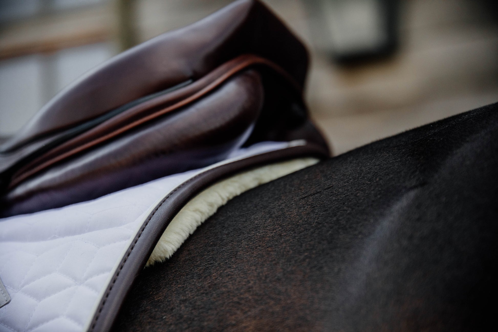 The artificial leather edge and white piping ensure a fancy look. This together with the fancy star quilting pattern makes this saddle pad unique. Because of the artificial sheepskin on the inside of the saddle pad and on the withers, this Skin Friendly Saddle Pad offers nothing but comfort. The subtle artificial leather logo is placed in a central, slightly higher place which always leaves space for embroidery of your own logo if desired.