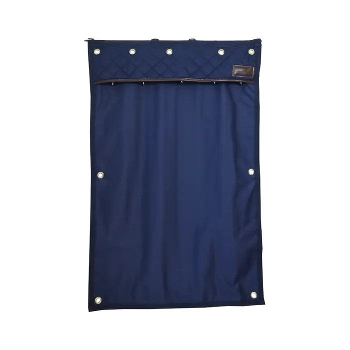 This Stable Curtain Waterproof features five reinforced Velcro to attach to the stall. Under the flap are five snap hooks to attach accessories such as bridles, rack for rugs, grooming hook, etc. The snap hooks are carefully put away behind the flap with artificial leather Kentucky logo so you don’t see them. The artificial leather piping on the flap and the fancy artificial leather Kentucky logo all contribute to this fancy look. Machine washable at 30°, no dryer.