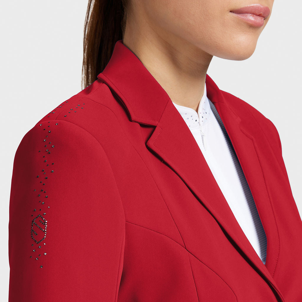Luxuriously adorned with Swarovski Crystals, this jacket features a hidden zipper behind the buttons and boasts stylish tailoring for a longer fit. With zipped pockets and four-way stretch, it's both practical and elegant. Made from breathable, UV protected European fabric that never fades, it's also machine washable for easy care. Additionally, this jacket is compatible with Helite Airvests. Crafted from a blend of 73% polyamide and 27% elastane for ultimate comfort.
