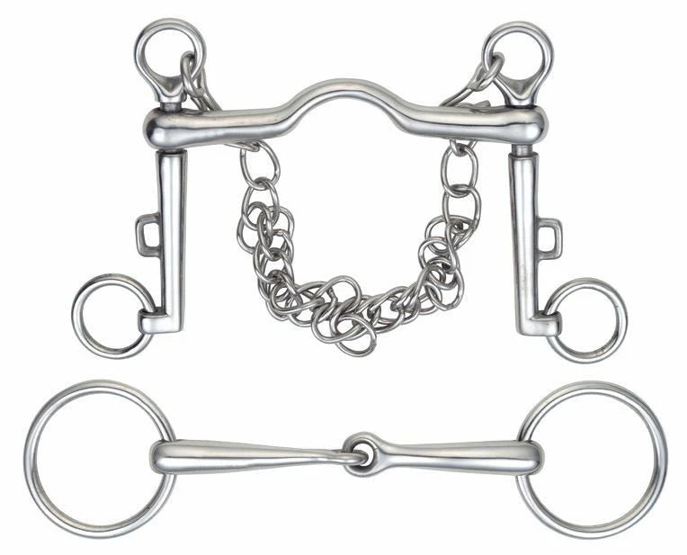 This full sized Weymouth set has a loose ring bradoon to allow more movement. Mouthpiece thickness: 14mm Weymouth/14mm Bradoon. Cheek height: 125mm Weymouth/55cm Bradoon. Stainless steel is the most common material for bits. Durable, easy to clean, tasteless and does not rust.